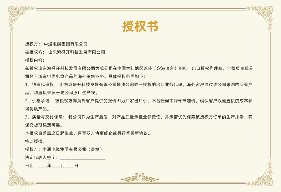 我们与中通电缆集团有限公司(中国领先的电缆制造商之一)建立了长期战略合作伙伴关系。这种联盟确保我们可以直接对接他们的生产线,并在资源分配上享有优先权。这意味着我们能够为您提供工厂直供的价格,而没有通常中间商加价的部分。作为中通电缆集团有限公司的授权出口合作伙伴,我们担任其面向国际市场的专用销售渠道。我们报价的每一件产品都拥有中通制造的专业技术和质量控制背书,确保产品的完全可追溯性和质保支持。